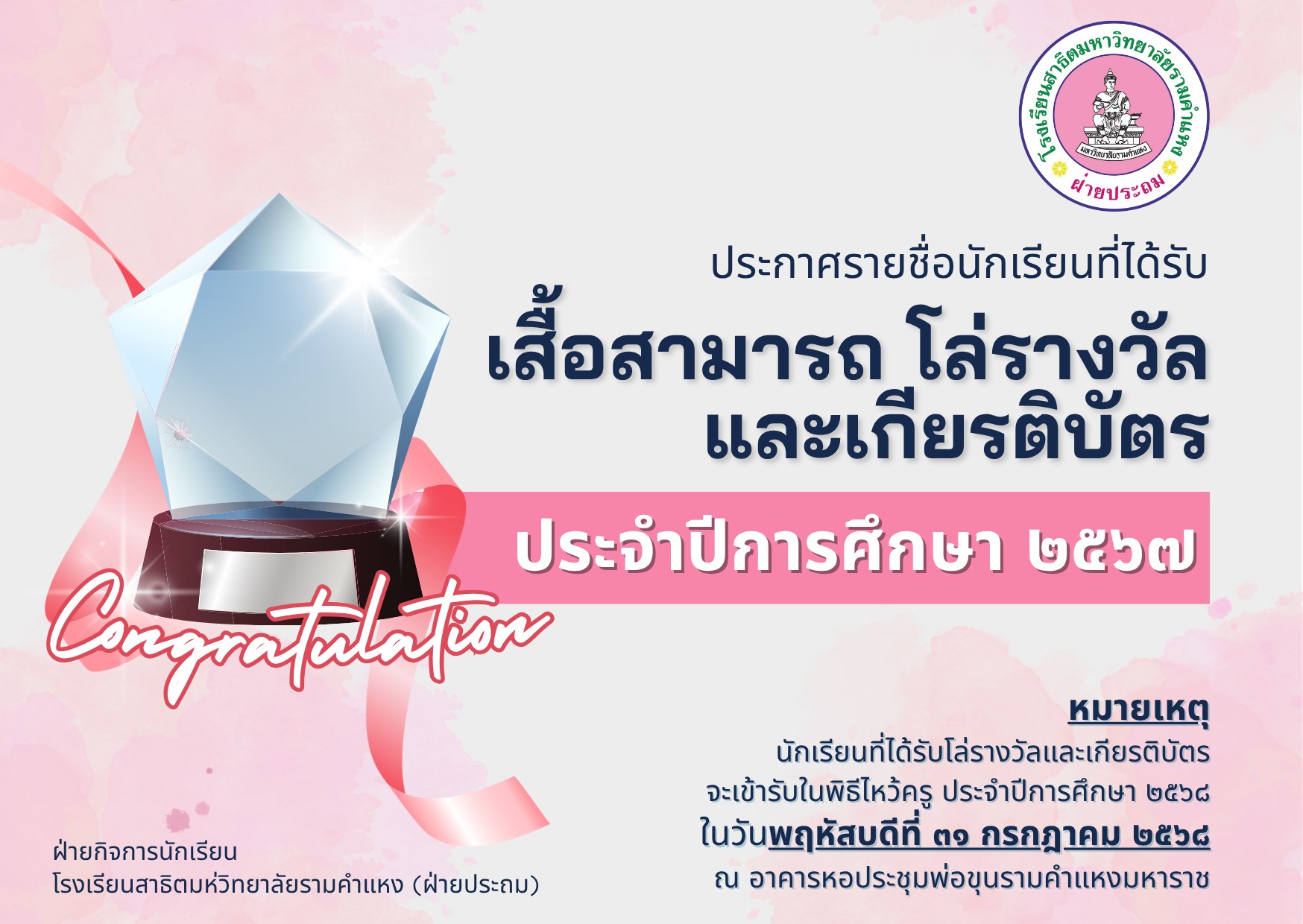ประกาศรายชื่อนักเรียนที่ได้รับเสื้อสามารถ โล่รางวัล และเกียรติบัตร ประจำปีการศึกษา 2567