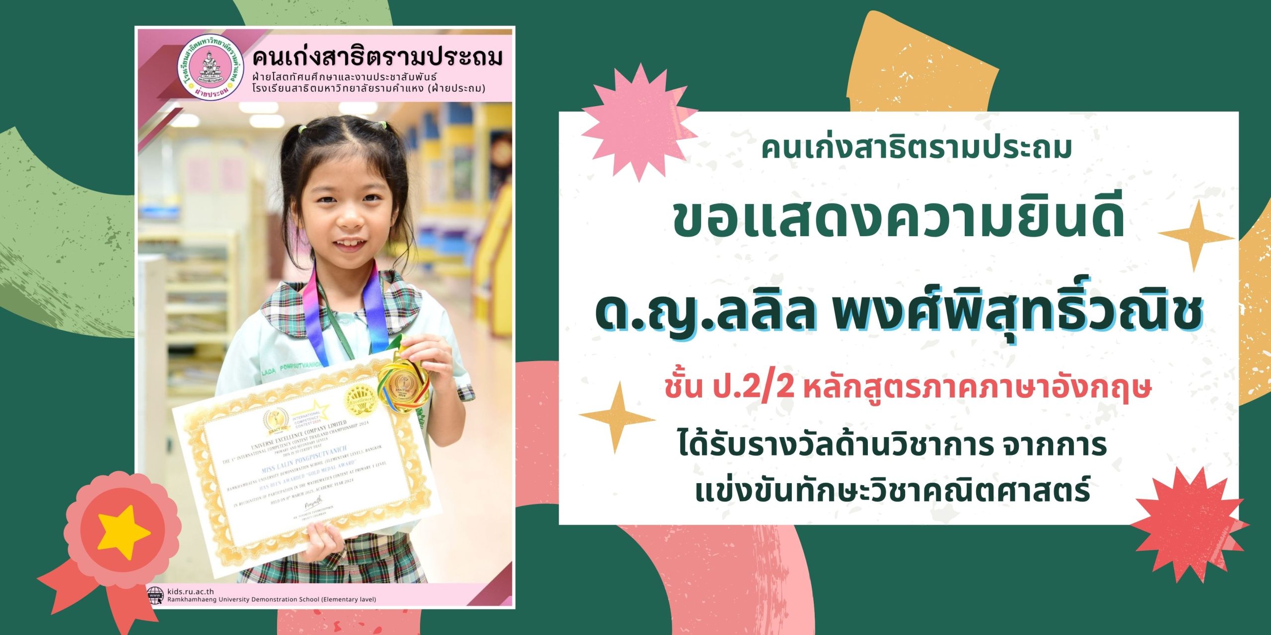(โครงการทดสอบความเป็นเลิศสมรรถนะวิชาการนานาชาติ ภาคภาษาอังกฤษ) ชั้น ป.1 สอบแข่งขันที่มหาวิทยาลัยเกษตรศาสตร์ โดยได้รับรางวัลเมื่อวันที่ 10 สิงหาคม 2568